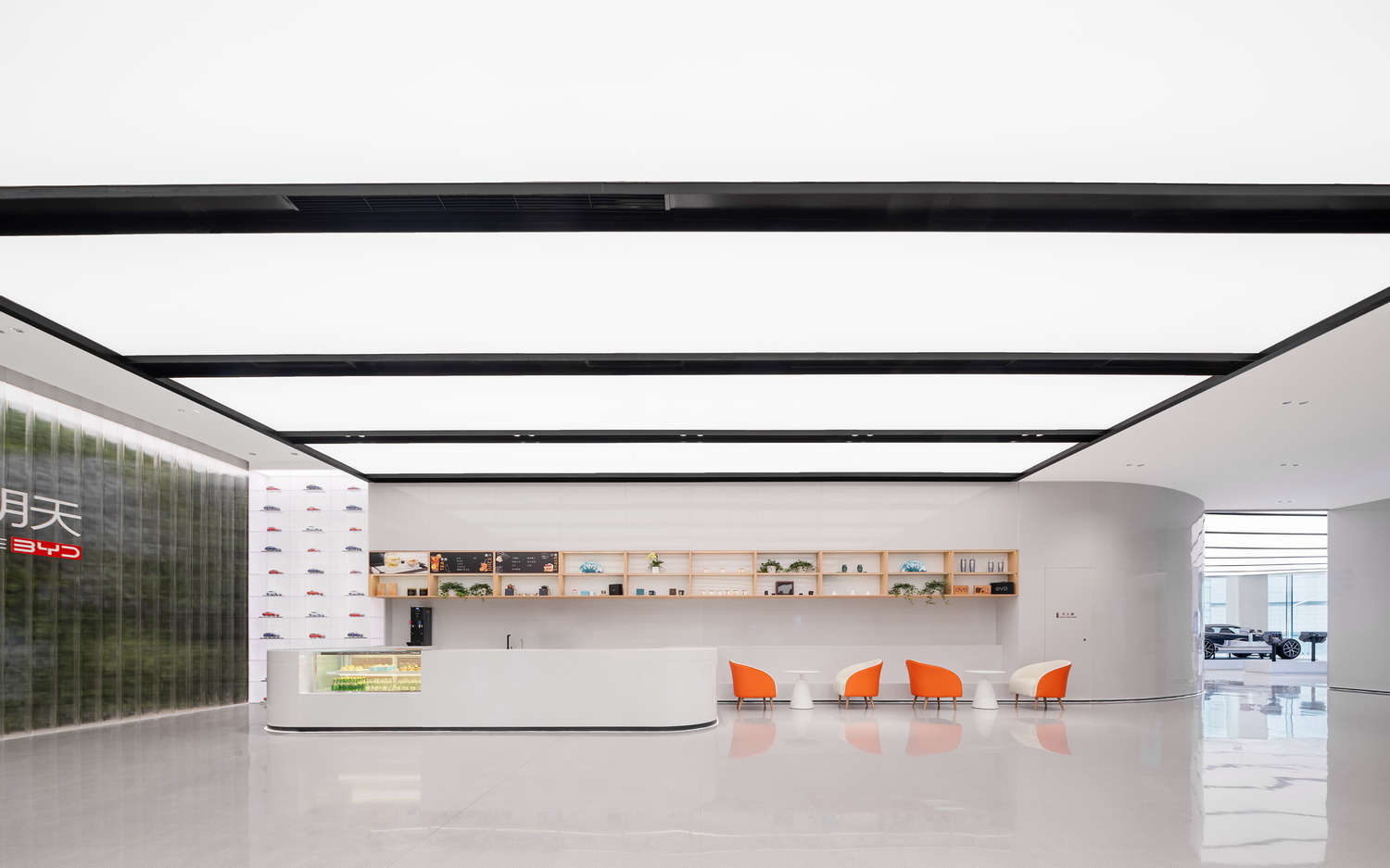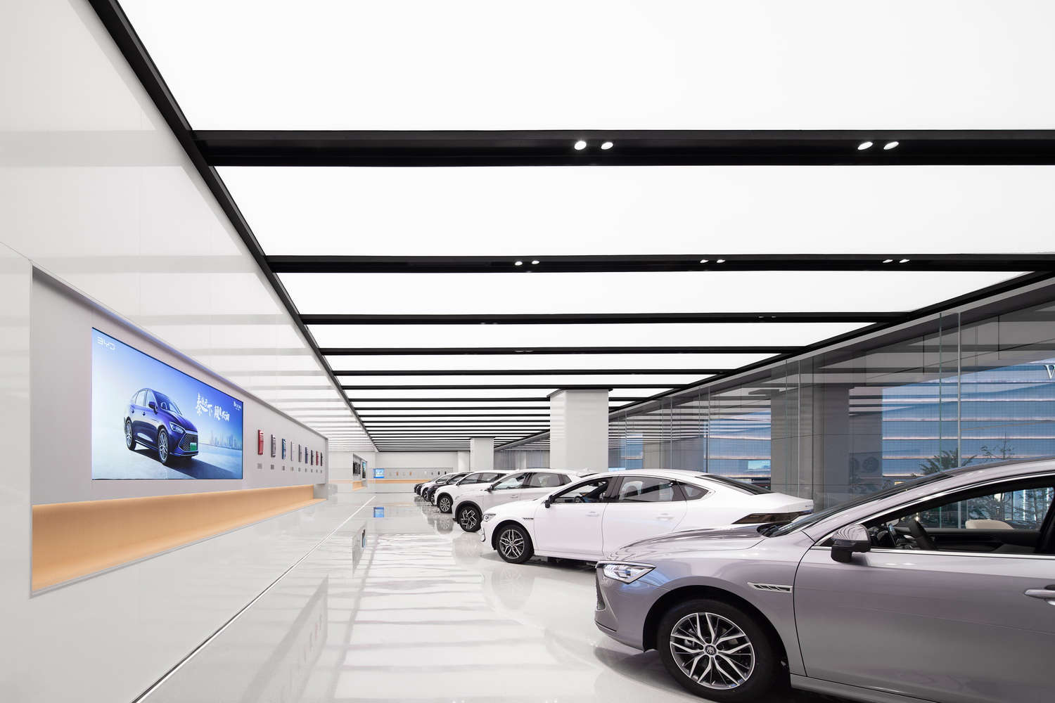 本项目为 比亚迪汽车 4S 店展厅及交付区的照明升级工程,核心目标是通过大面积 透光软膜天花吊顶系统 打造更具未来科技感、绿色环保与高端展示效果的光环境。