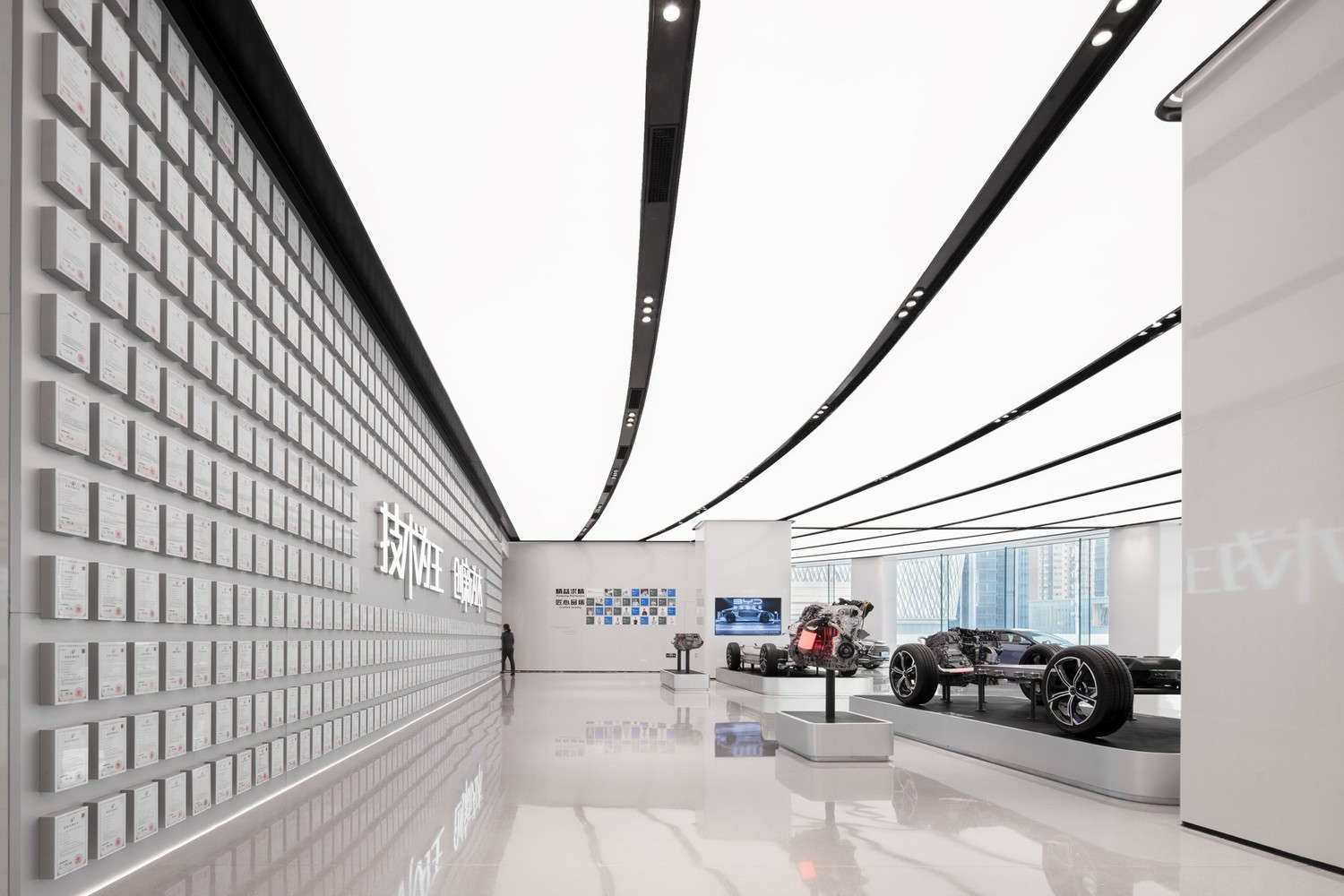 软膜天花让整个展厅顶部宛如一整块“发光的天空”,没有任何灯具外露,使空间看起来: