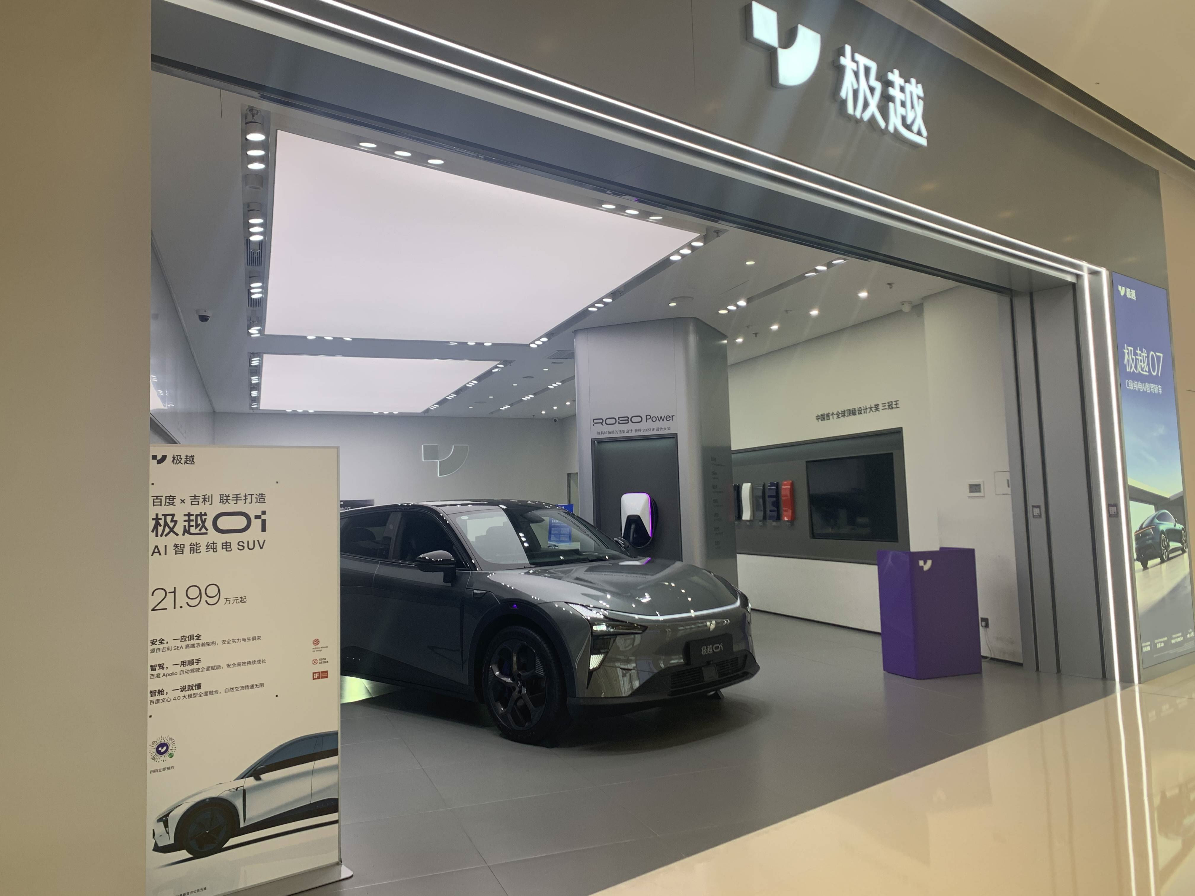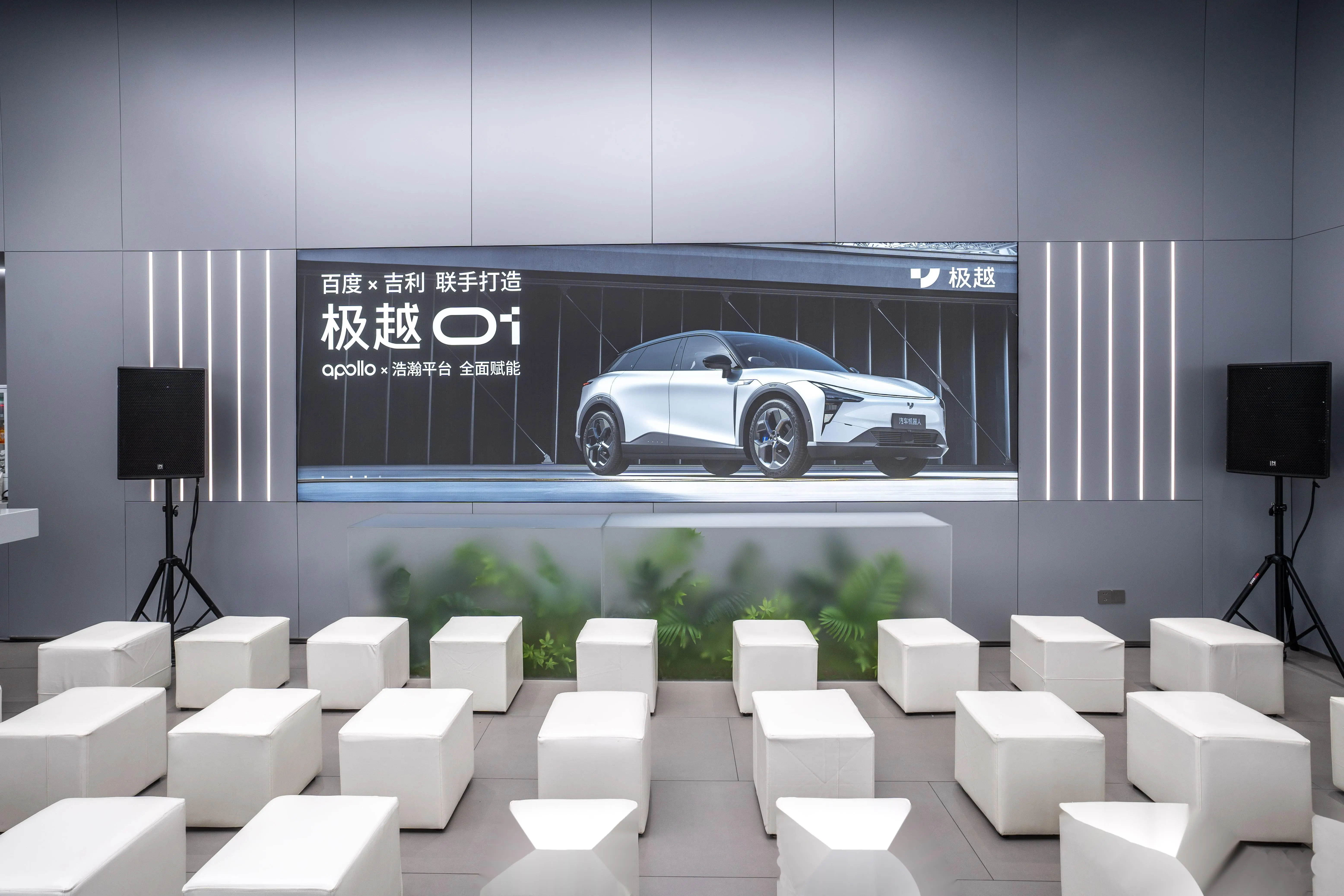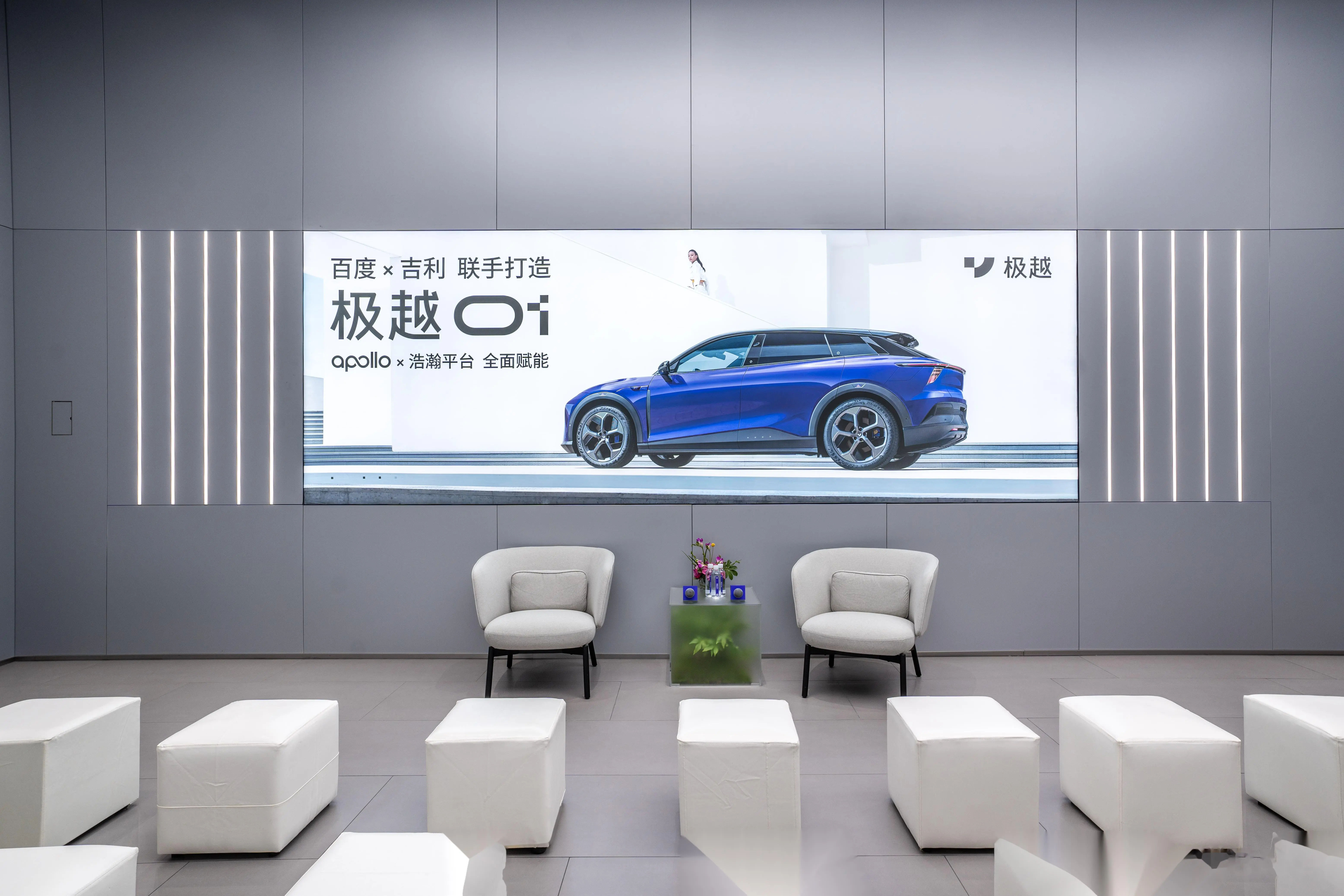 灯箱部分主要布置在品牌背景墙和车型卖点展示区,风格都是极简的超薄边框,亮度不会调得太高,只求画面干净、内容清晰。灯箱色彩和天花光色相近,看起来不会割裂。整体完成后,展厅的科技氛围比传统灯具更强烈,也更符合极越品牌的视觉调性。
