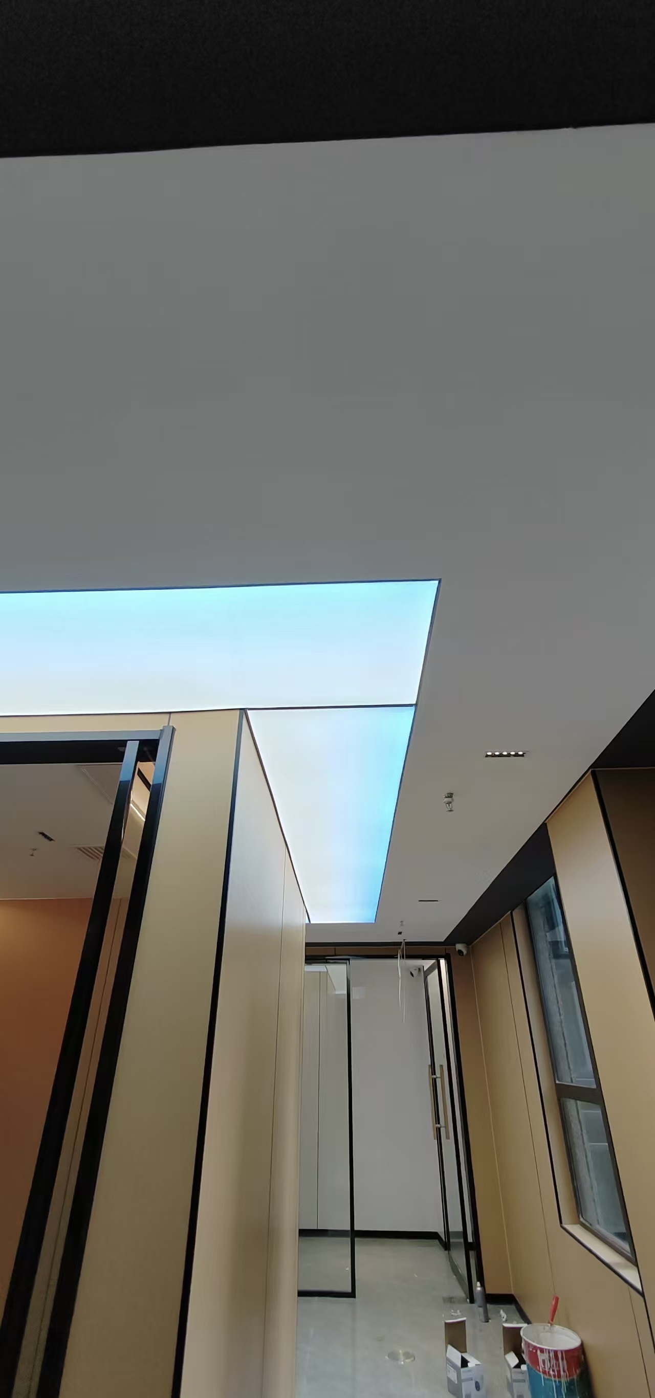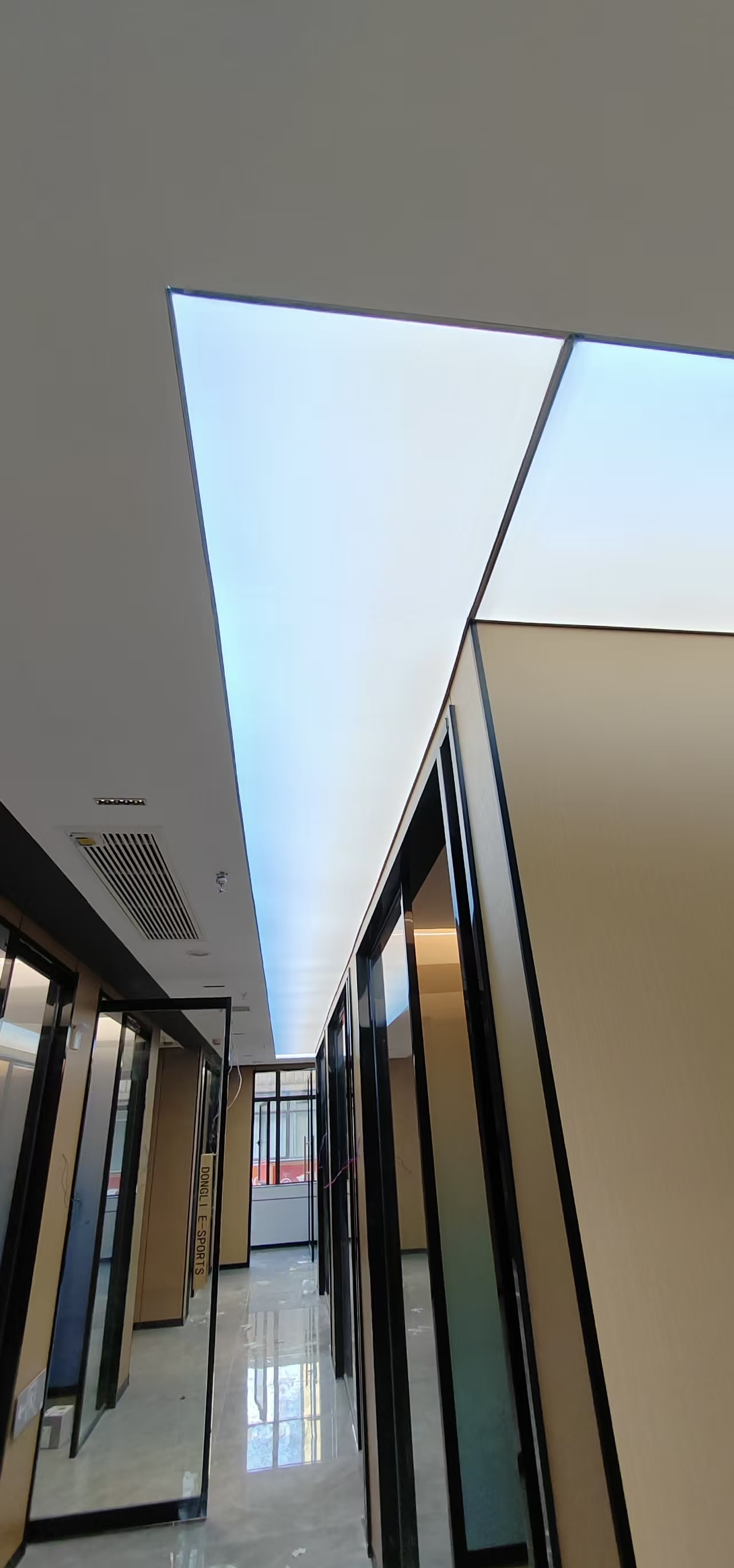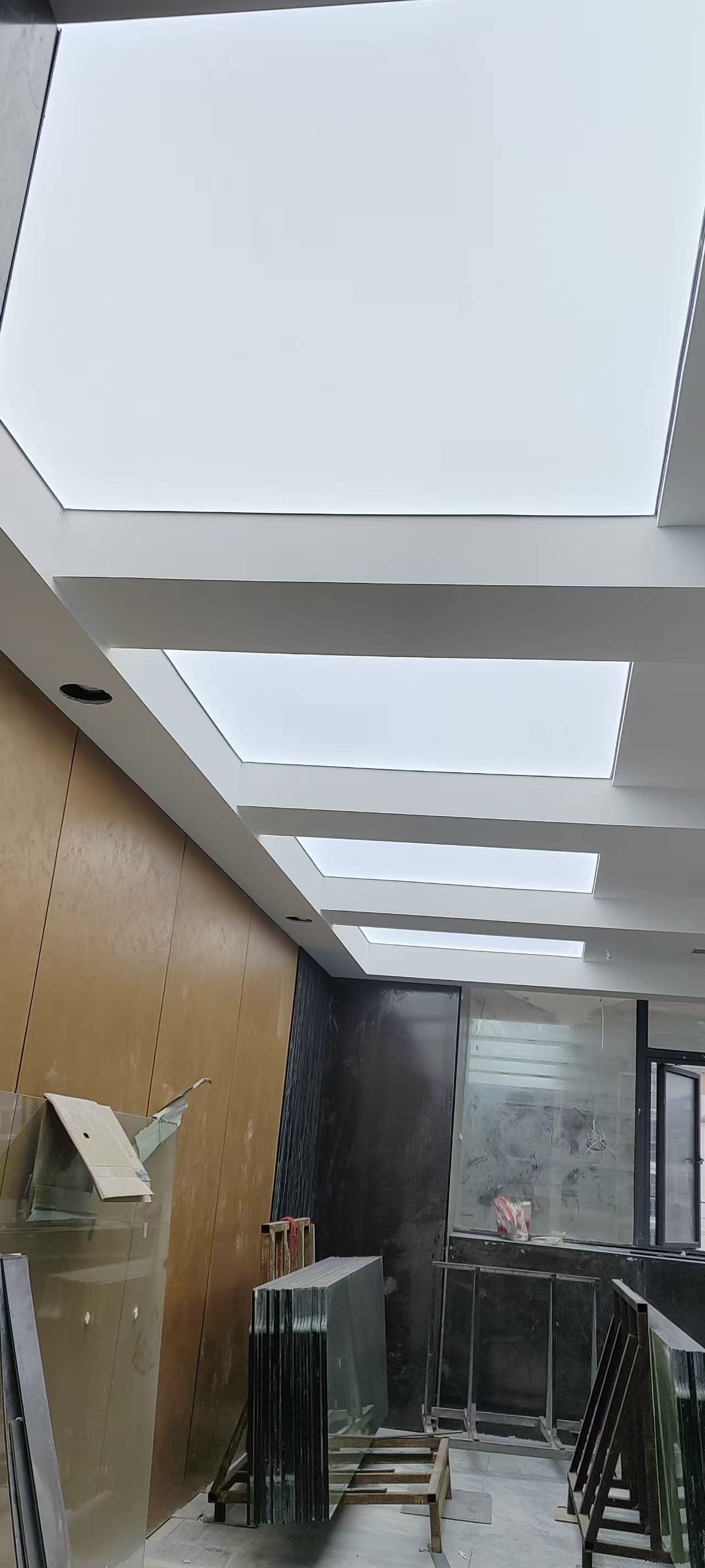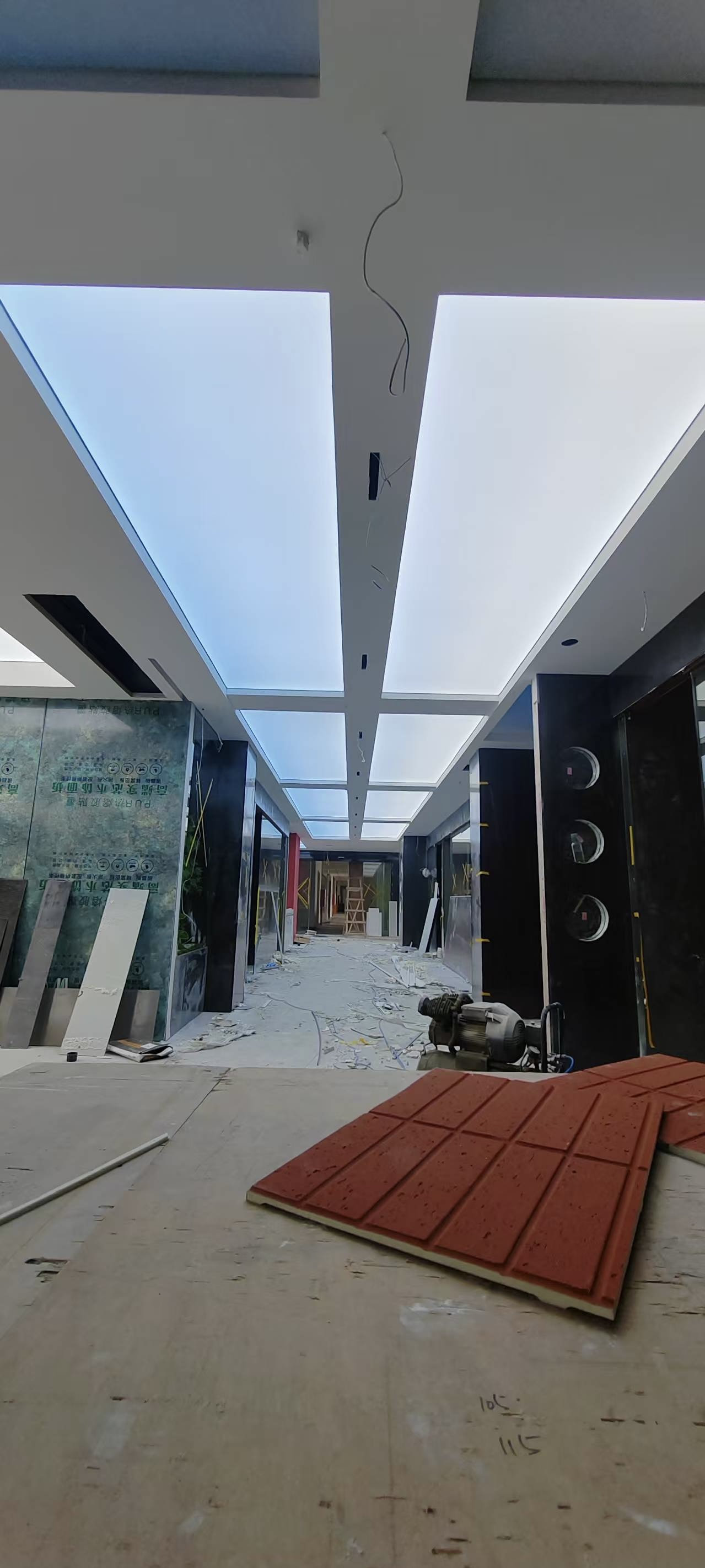 真正装灯的那天,我在现场守了一整天。先把 LED 灯带固定在灯槽里,间距、高度都调了好几遍,就怕光打在软膜上明暗不一。然后就是拉软膜,这活儿真得有耐心,先把四边的胶条卡进龙骨,再一点点把膜拉平、拉紧,不能太用力怕扯坏,也不能松松垮垮的。等最后一块软膜装完,一通电的瞬间,我跟客户都愣了一下 —— 不是那种刺眼的白,而是从浅蓝到白的渐变,就像真的透过天窗看出去的天空一样,走廊一下子就 “活” 了。