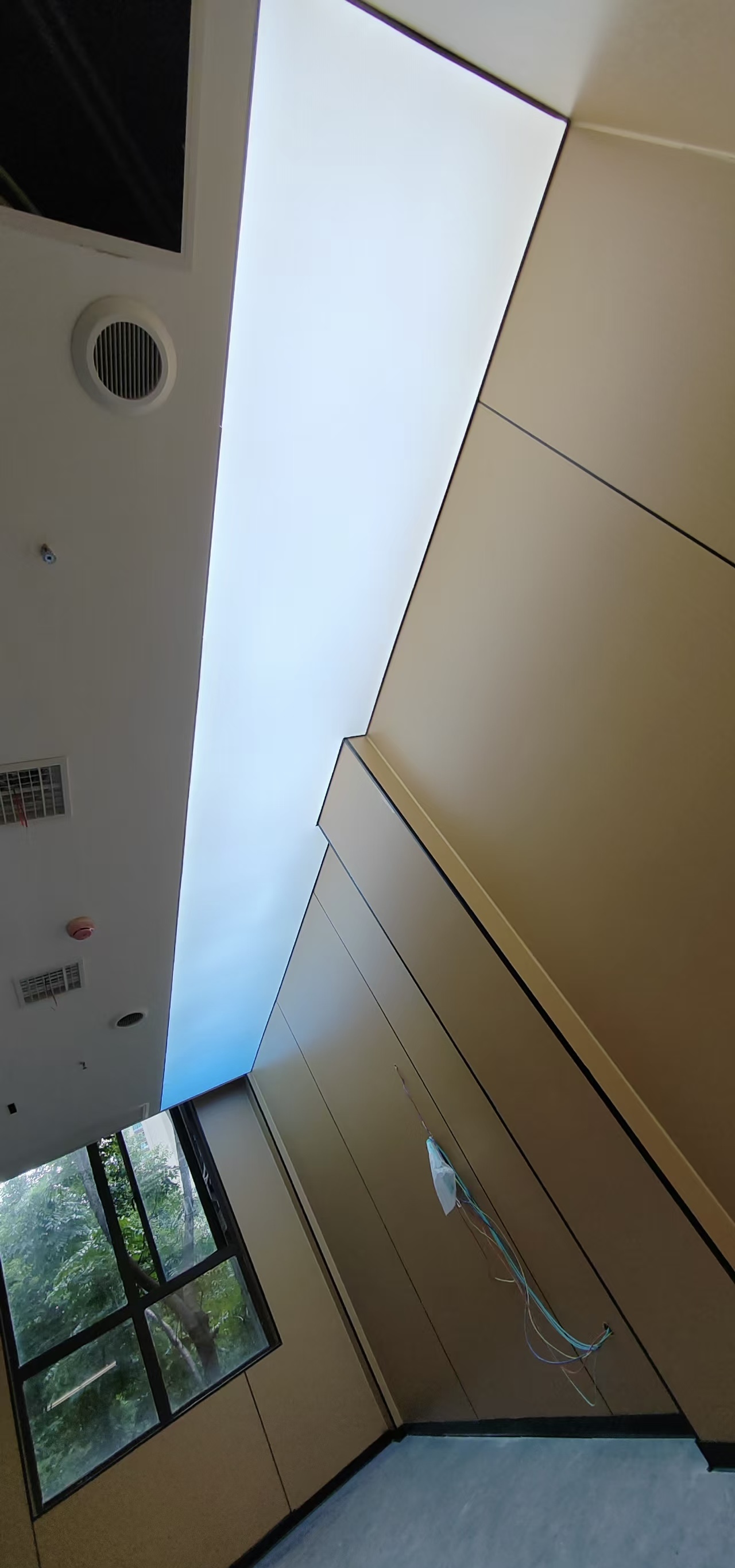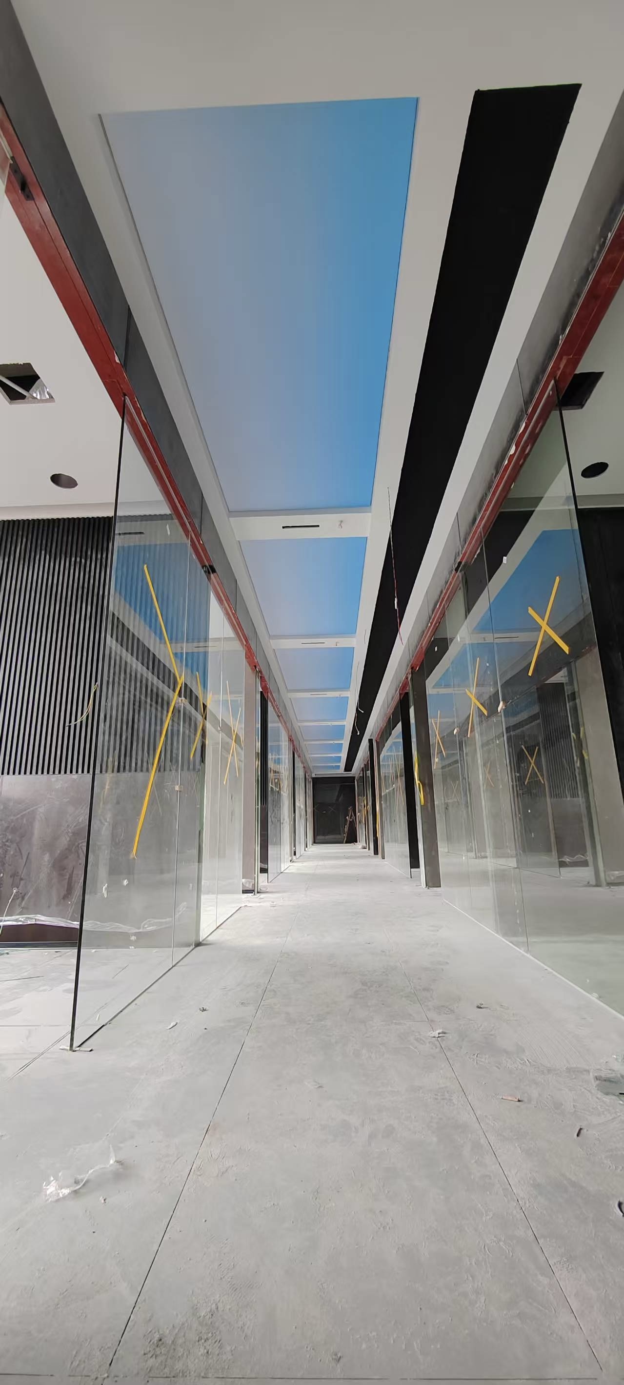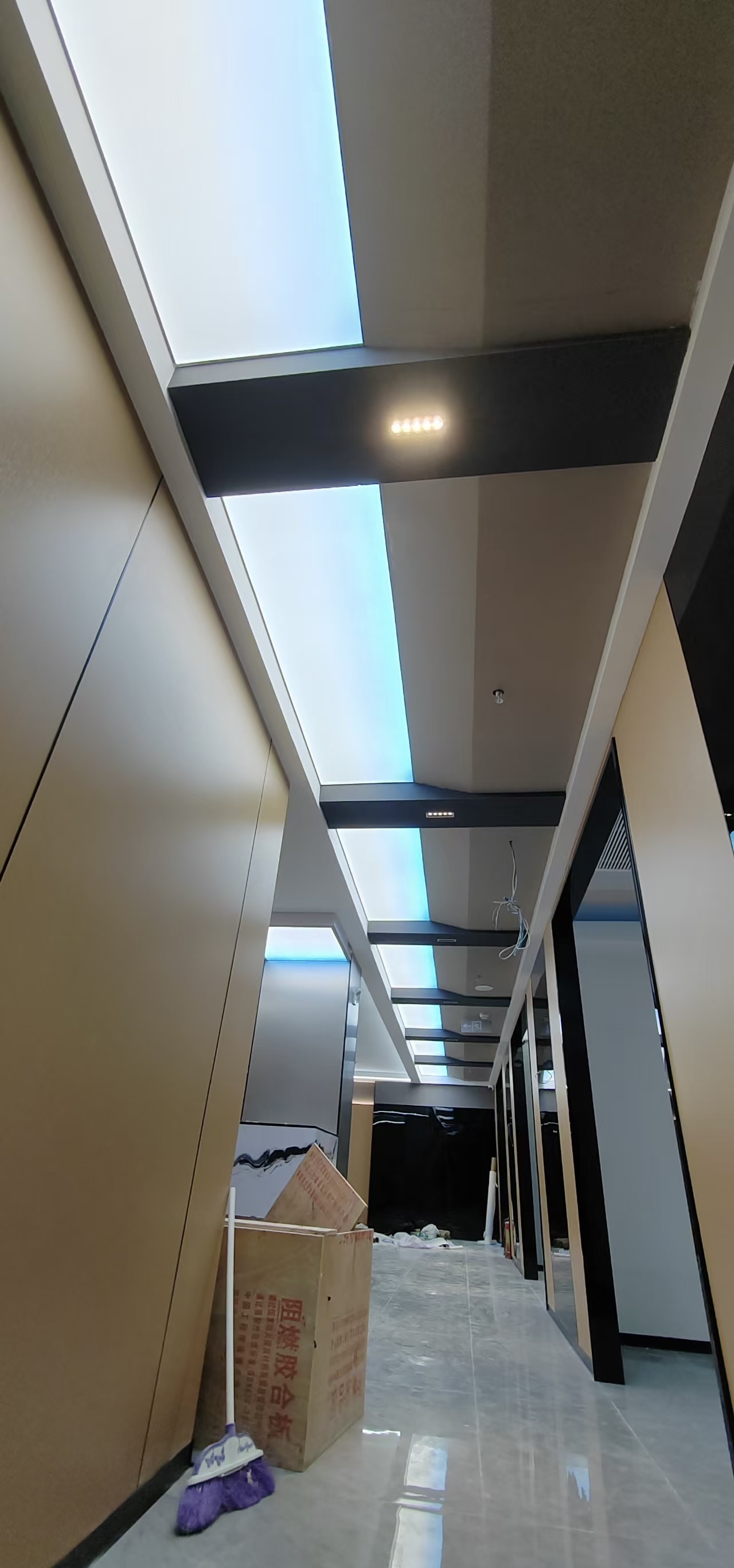 真正装灯的那天,我在现场守了一整天。先把 LED 灯带固定在灯槽里,间距、高度都调了好几遍,就怕光打在软膜上明暗不一。然后就是拉软膜,这活儿真得有耐心,先把四边的胶条卡进龙骨,再一点点把膜拉平、拉紧,不能太用力怕扯坏,也不能松松垮垮的。等最后一块软膜装完,一通电的瞬间,我跟客户都愣了一下 —— 不是那种刺眼的白,而是从浅蓝到白的渐变,就像真的透过天窗看出去的天空一样,走廊一下子就 “活” 了。