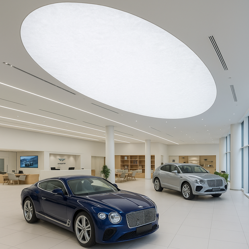 A级防火膜(Grade A Fire-proof Membrane)是以「玻璃纤维无纺布 + 氟树脂 + 维纶纤维」为基材,单/双面覆高分子涂层制成的柔性卷材,厚度 0.2-0.25 mm,重量 300-350 g/㎡。具备 A1 级不燃性能(GB 8624-2012),明火不燃、无烟、无滴落,是现行软膜天花体系里防火等级最高的透光材料。