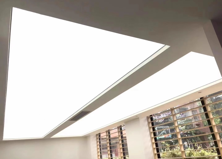 透光膜(Translucent Stretch Film)通过张拉固定于专用龙骨,结合LED灯带/导光板/面板光源,获得大面积、无颗粒的均匀面光。系统重量轻、对基层要求低、施工少湿作业,维护便捷;可提供不同表面与透光率版本,并支持声学微孔与图案印刷,满足功能照明与视觉美学的双重需求。