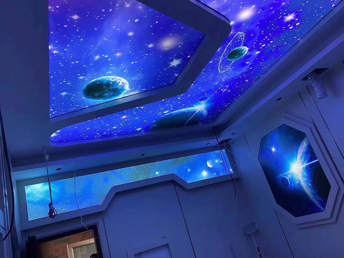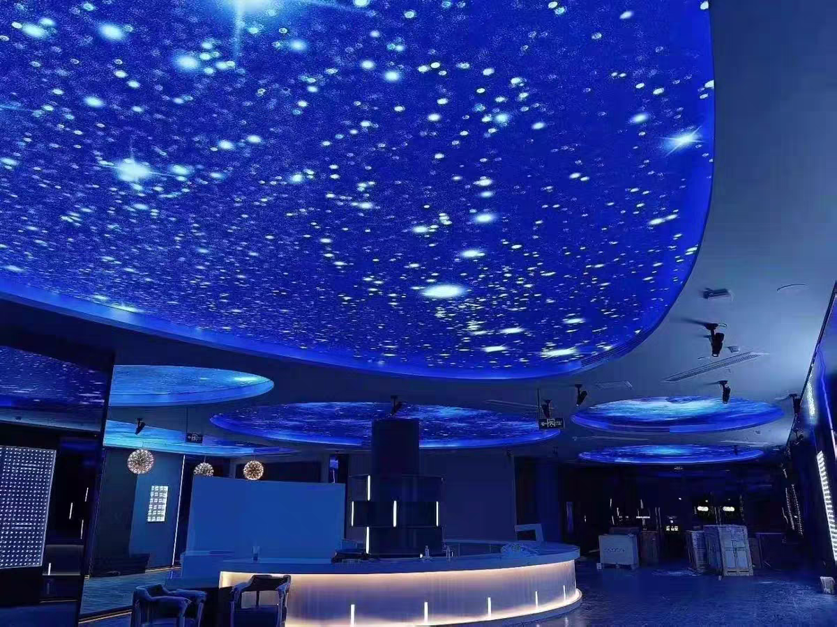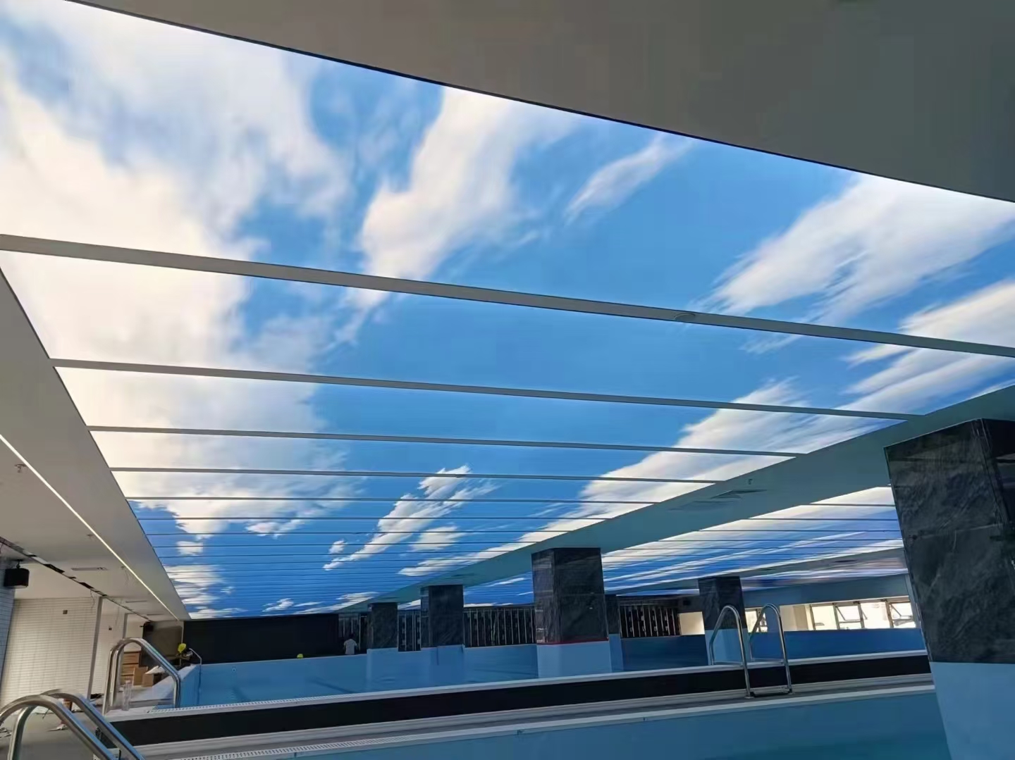 一款“见光不见灯”的沉浸式天花解决方案,通过 A/B 级高透软膜 + UV 双层高清喷绘 + 高密度 LED 矩阵背光,把夜空繁星、银河、蓝天白云等自然场景 1:1 还原到室内顶部。广泛应用于亲子中心、影院大堂、酒店套房、餐饮包间、泳池、别墅、KTV 及商业美陈空间,实现“抬头即风景”的视觉爆点,兼顾基础照明与氛围造景双重功能。