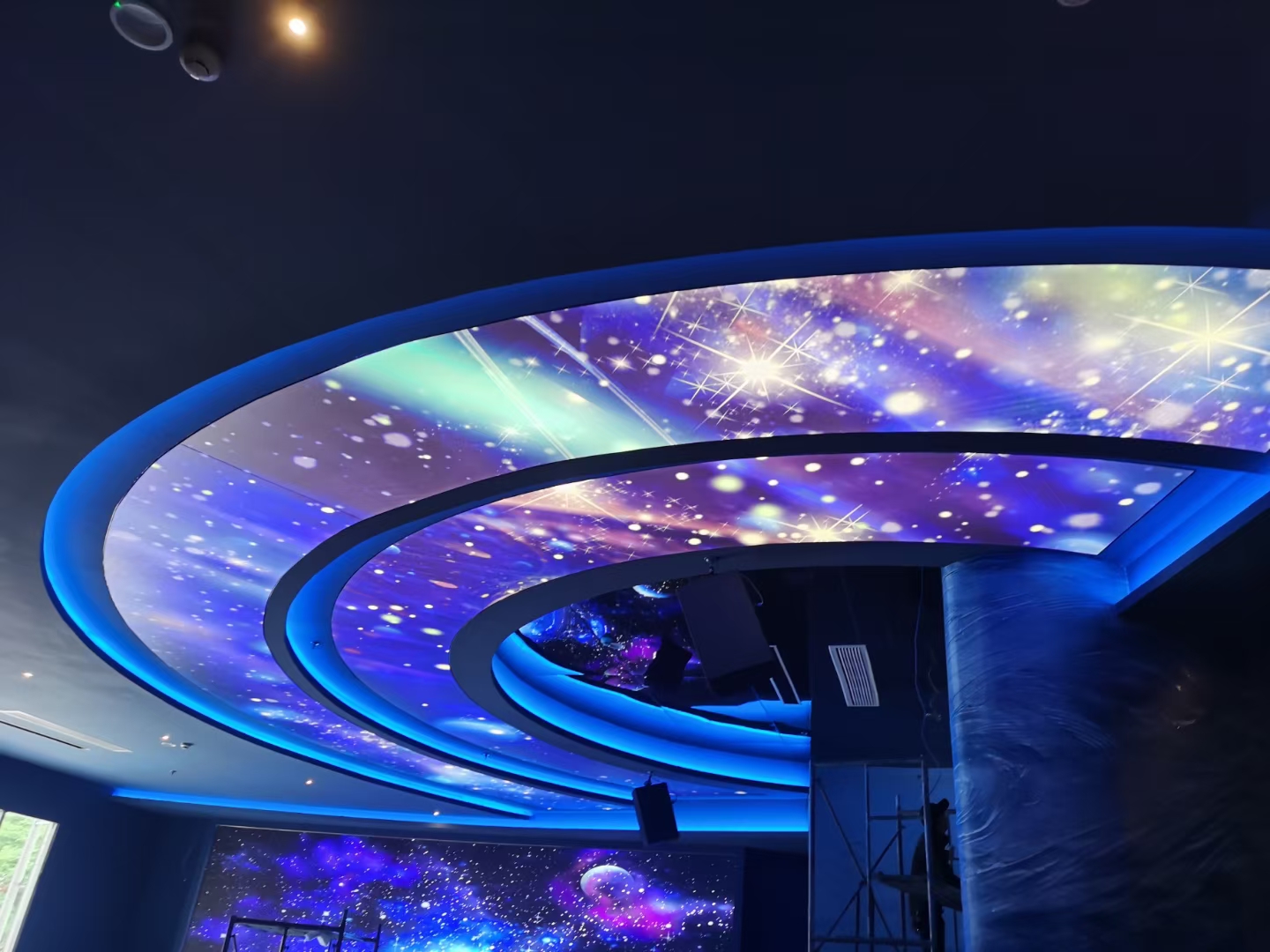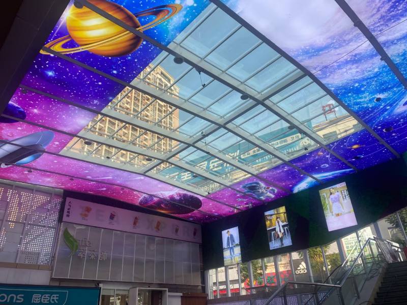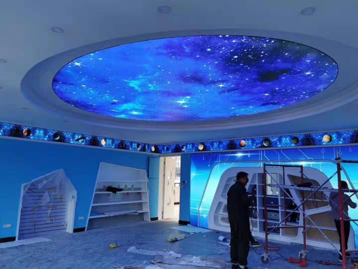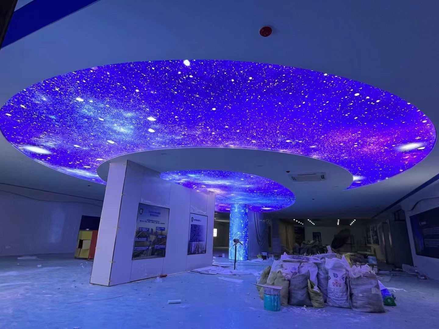 一款“见光不见灯”的沉浸式天花解决方案,通过 A/B 级高透软膜 + UV 双层高清喷绘 + 高密度 LED 矩阵背光,把夜空繁星、银河、蓝天白云等自然场景 1:1 还原到室内顶部。广泛应用于亲子中心、影院大堂、酒店套房、餐饮包间、泳池、别墅、KTV 及商业美陈空间,实现“抬头即风景”的视觉爆点,兼顾基础照明与氛围造景双重功能。