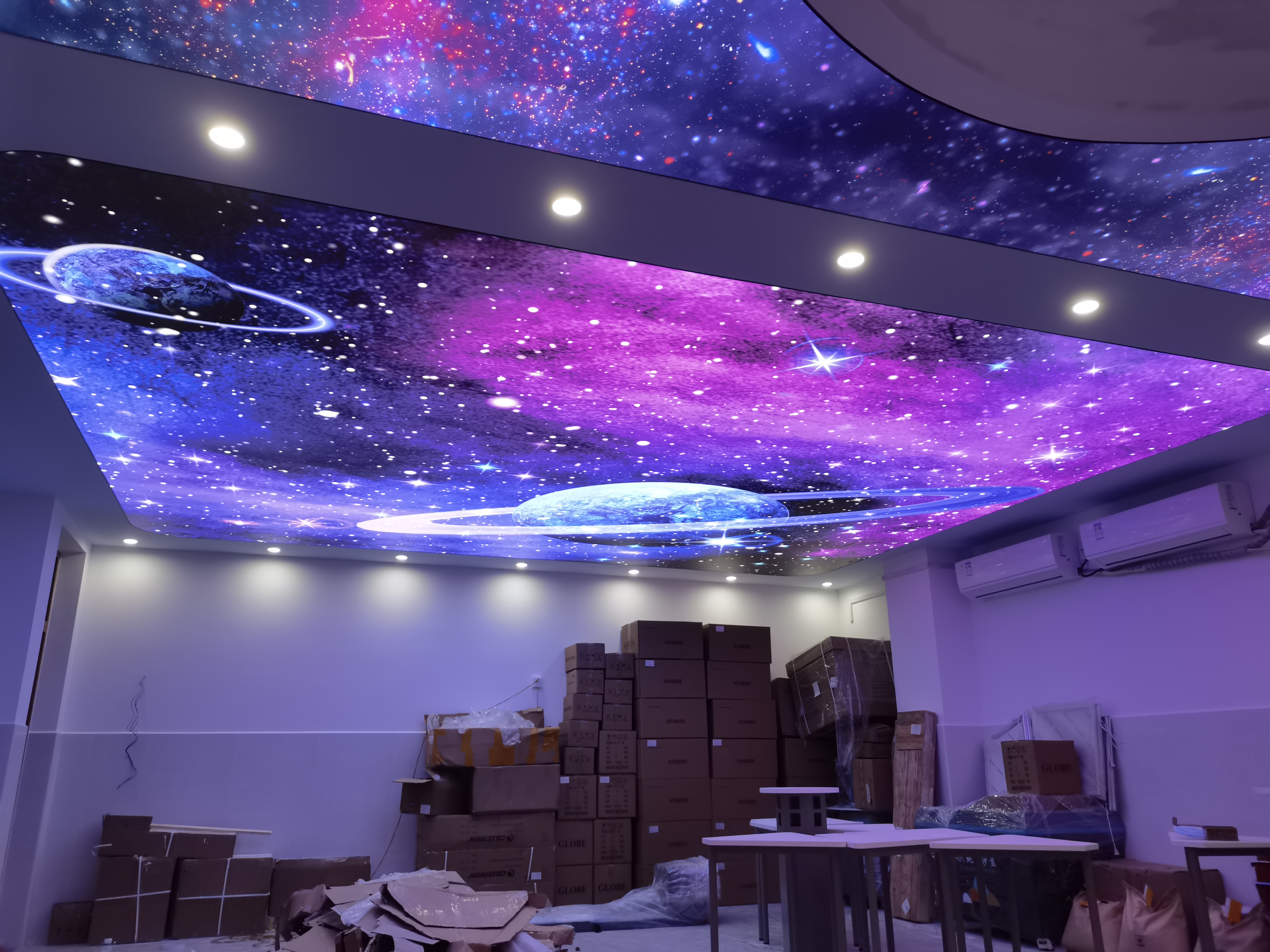 业主是个科幻迷,想把家里的视听室做成那种“遨游太空”的感觉。如果只贴个壁纸太low了,于是我给他上了喷绘软膜+光纤灯的大招。